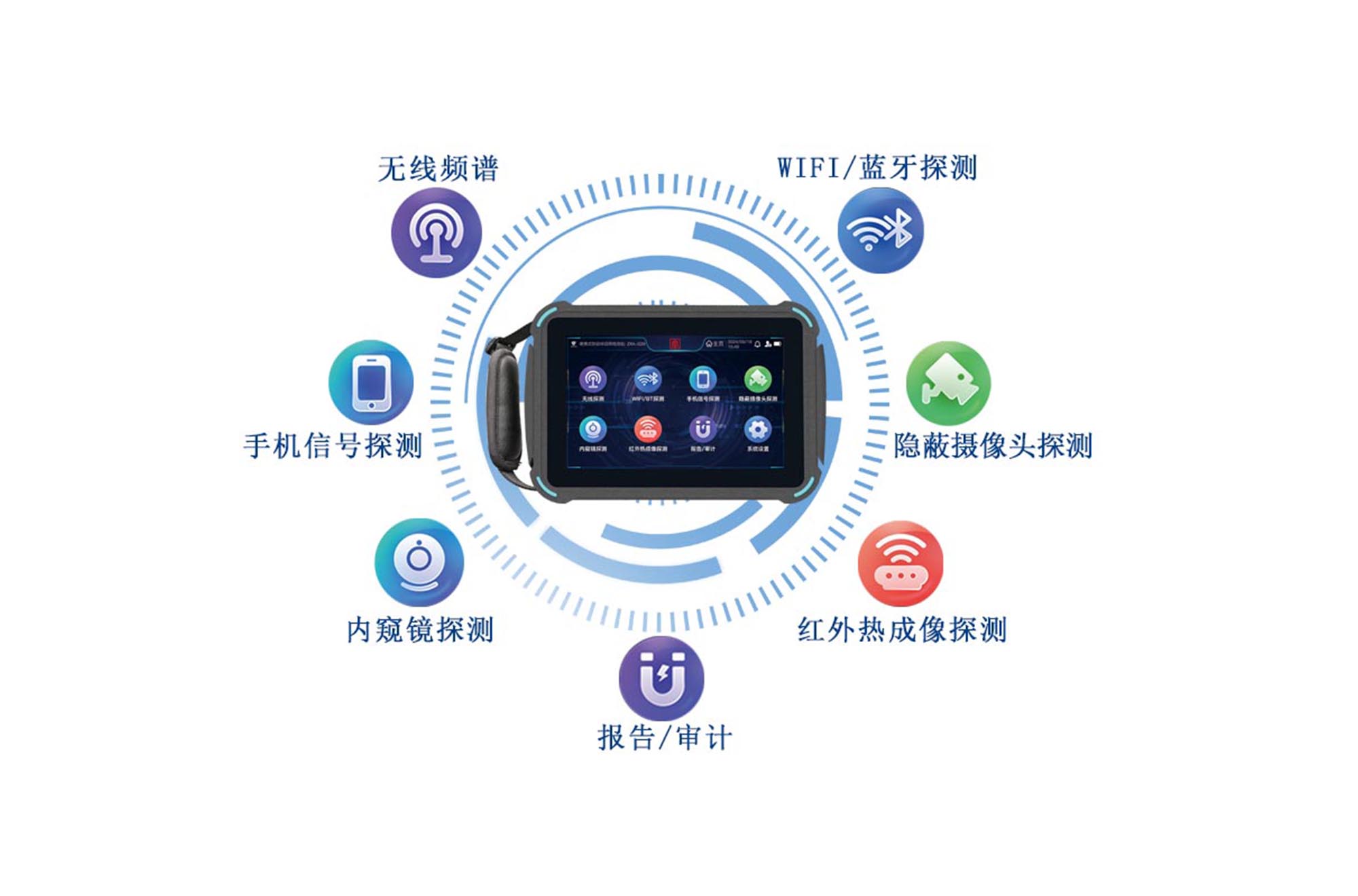 本产品针对窃听窃照对安全保密带来的威胁危害,运用宽带探测、频谱分析、红外热成像、无线信号侦测等技术,查找发现暗藏的电子窃听、窃照装置,及时消除窃密泄密隐患问题,保障重要涉密场所安全。产品支持WIFI、蓝牙、移动通信等无线信号检测,支持摄像头、麦克风等窃听窃照设备检测,主要功能包括但不限于可疑手机信号分析排查、对有线/存储微型摄像头进行检测、对 WIFI/BT信号进行检测分析、具备红外热成像和可视内窥镜检测功能,对发现可疑装置自动告警,AI智能分析,自动整理,按类给出分析报告。